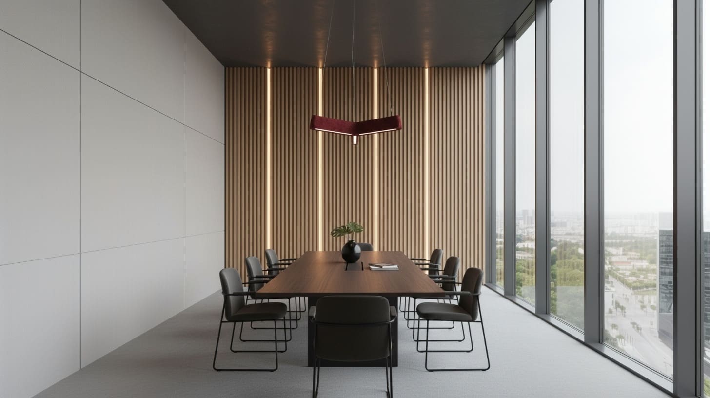 Flare introduces a bold, directional shape that emits warm light while absorbing resonance through its acoustic body. Its sculptural presence amplifies atmosphere in boardrooms, executive dining areas and elevated office interiors.