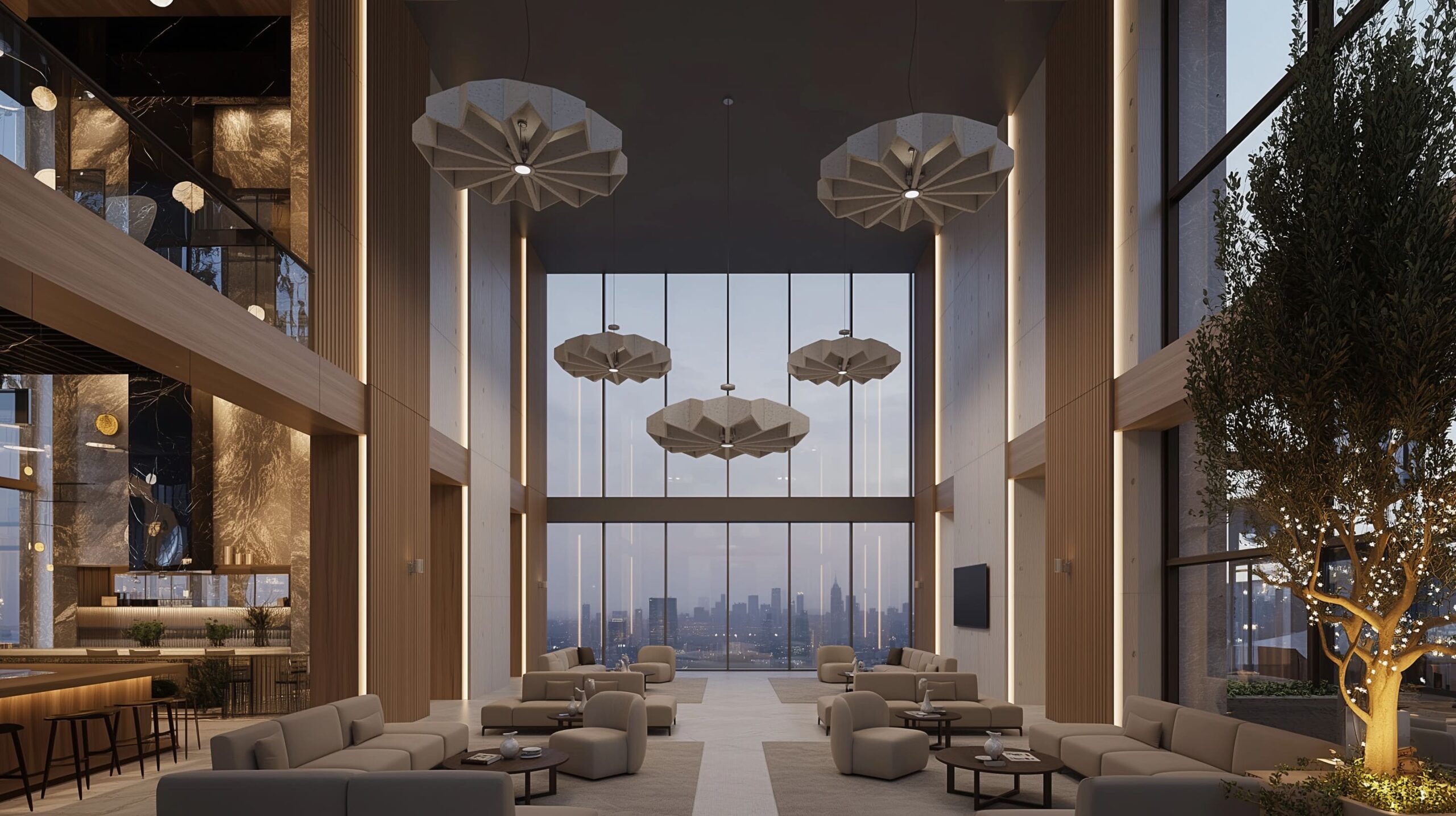 This version of Luma presents polygonal acoustic facets that reduce echo and create a dramatic sculptural effect. A warm central glow fills large rooms with depth and quiet confidence. Ideal for restaurants, large atriums and design-forward commercial interiors.