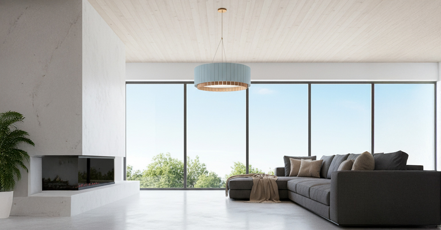 Lume pairs a clean cylindrical aesthetic with a warm downward glow that stabilizes the atmosphere. Its acoustic surface absorbs echo and adds clarity to home offices, reception areas and workspaces where serenity is essential.