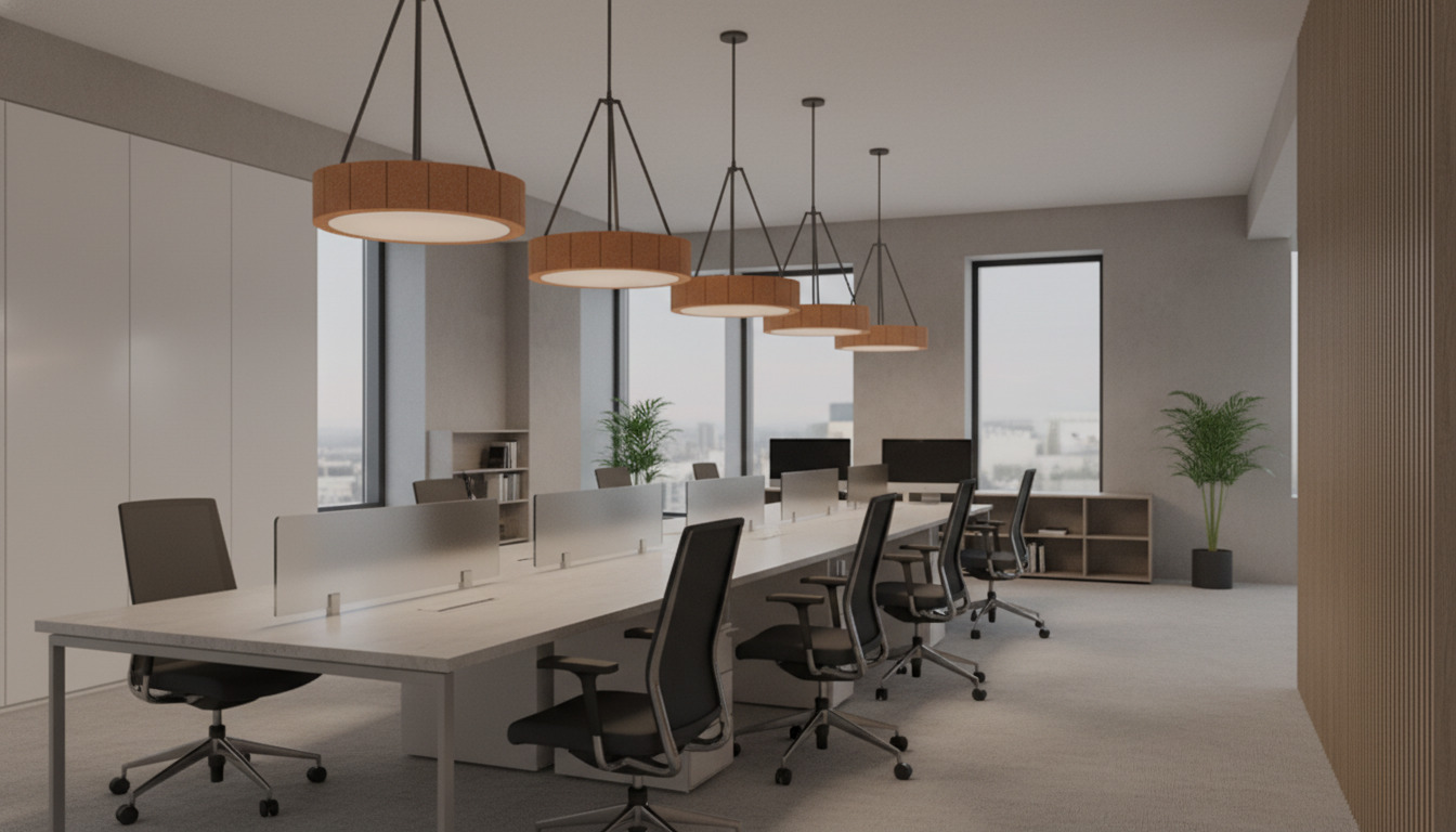 Orbit frames the space with a subtle ring of illumination while its acoustic body reduces surrounding noise. Ideal for sophisticated reception areas, contemporary dining and serene collaborative zones.