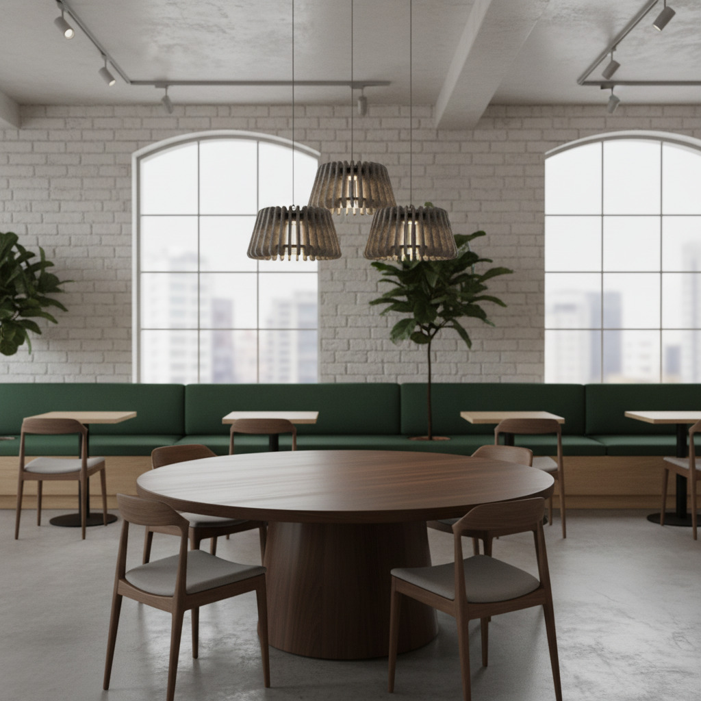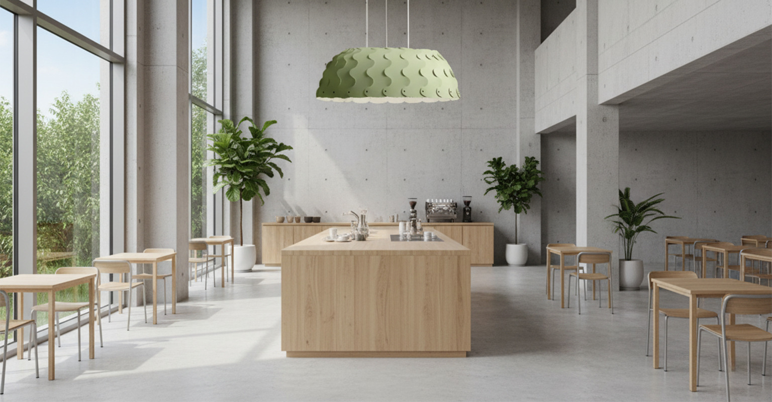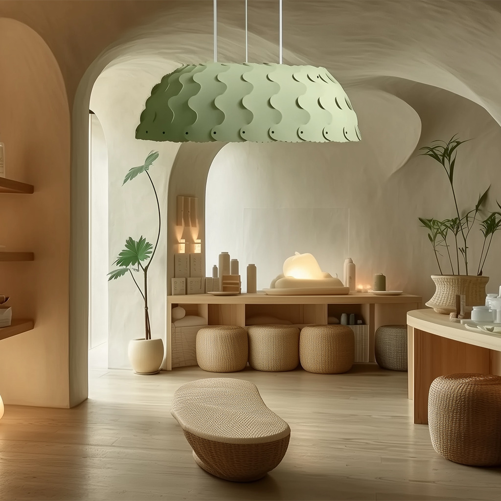 Sora blends organic curves with a soft, ambient glow that settles gently into the room. Its textured acoustic shell absorbs sound from multiple angles, creating a naturally quiet and soothing environment. Ideal for residential dining, wellness spaces, creative studios and hospitality interiors where tranquility and atmosphere must feel effortless and refined.